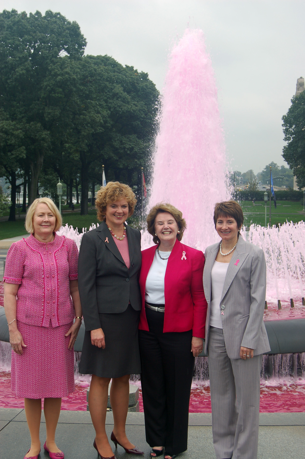 October is breast cancer awareness month, which is evident when you spot the Capitol Fountain in Harrisburg in its pink glory! First Lady Susan Corbett, who produced a video for the PBCC, was joined by Sheri Phillips, the Secretary of the Department of General Services, PBCC President and Founder Pat Halpin-Murphy, and PBCC Board Member and breast cancer survivor Debbie Freer for a kick-off event unveiling the pink fountain at the rear of the State Capitol Building.