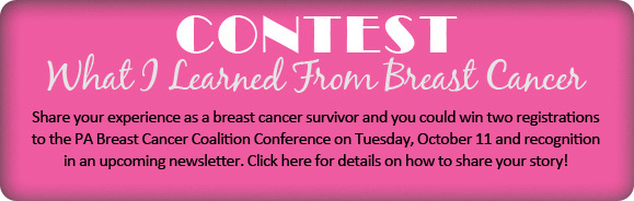 What did your experience with breast cancer teach you? Did it teach you about your own strength? What did you learn about the people around you? Were you inspired to become an advocate or make a career change? Share your story with the PBCC. In 500 words or less, tell us about your experience and you could be selected to be featured in one of the PBCC’s upcoming newsletters. One grand prize winner will receive two registrations to the PA Breast Cancer Coalition Conference. Email your story to contests@pabreastcancer.org by October 3 for consideration for our grand prize.