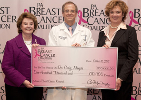 Pennsylvania’s First LadySusan Corbett, Honorary Chair of the Conference, shared her experience as the daughter of a breast cancer survivor in her keynote address. Thomas Frazier, M.D. and Mimi Barash Coppersmith were each presented with the Pink Ribbon Award for their contributions to the fight against breast cancer, and each spoke about why they are passionate about this battle. The big surprise of the day was the $100,000 research grant presentation to Dr. Craig Meyers.