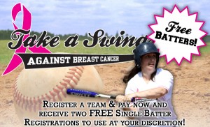 We’re less than two months away from the start of the 4th Annual Take A Swing Against Breast Cancer home run derby events! We have over 60 teams already registered, but there is still plenty of room for you and your friends, family, co-workers and neighbors to sign up!